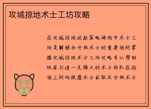 在《攻城掠地》这款策略游戏中,术士工坊是解锁和升级术士的重要场所。掌握攻城掠地术士工坊攻略,可以帮助玩家打造一支强大的术士部队,在战场上所向披靡。